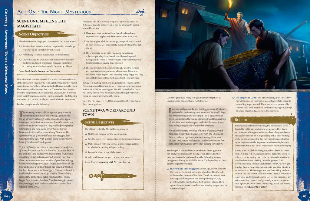 Other hidden forces—far more sinister—threaten all who live in Laurium, be they Roman, German, or from other cultures that have come to this place from afar. The lands near Laurium hide many secrets, including a rising swell of Mythos forces eager to corrupt this town. Dark cults lurk both within and outside its palisade walls, serving forgotten and malevolent gods whose goals imperil all of humanity. The few mortal groups knowledgeable enough to oppose such enemies also hide in Laurium, pretending to live ordinary lives while secretly locked in the Hidden Wars.