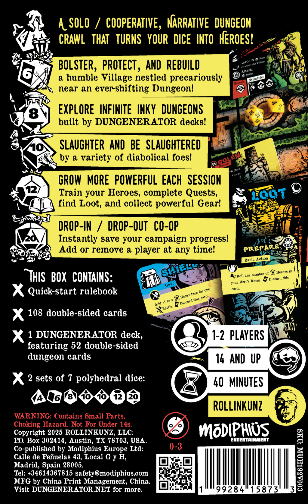 The DUNGENERATOR - DIE in a Dungeon is a solo or cooperative, narrative dungeon-crawler. In it, your polyhedral dice become doomed adventurers attempting to save and rebuild a village that sits on the edge of a labyrinthine, ever-changing dungeon!